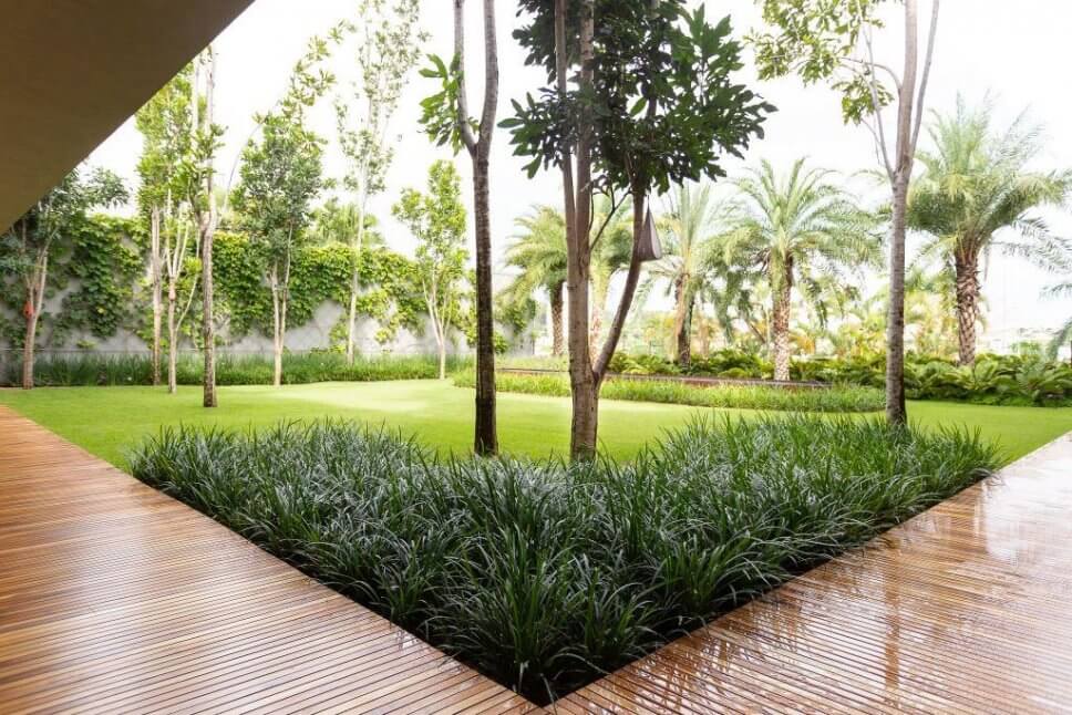 …die Architektin versieht die Außenanlage mit rundum verlaufenden, grafisch wirkenden Holzpodesten. Ein Element, das sich drinnen wiederholt…