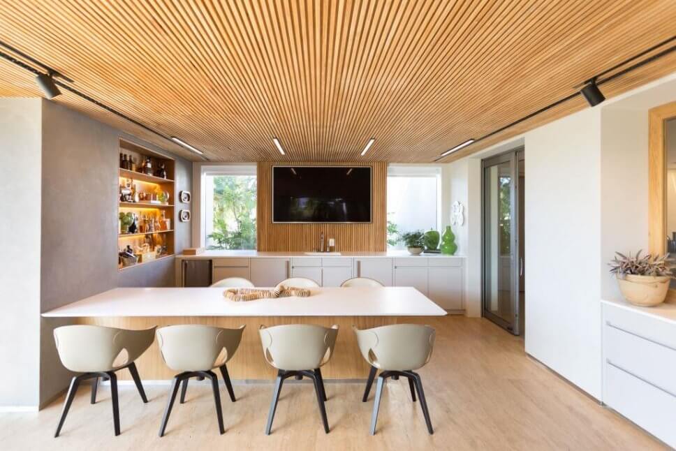 …so prägt den Essbereich eine Deckenverkleidung aus hellen Holzlamellen, die sich bis auf die Küchenzeile herunterzieht…