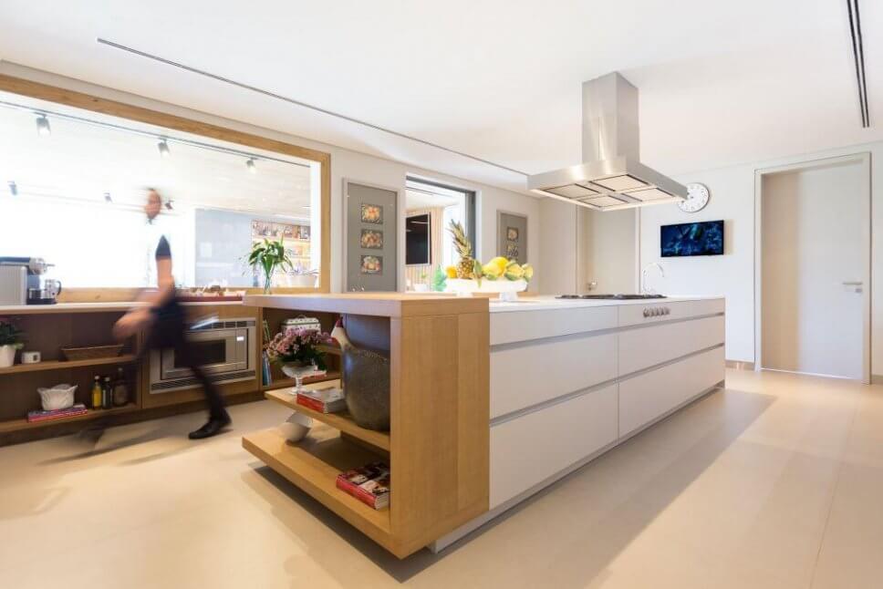 …diese korrespondiert mit einem freistehenden, holzverkleideten Inselblock, an den sich eine eindrucksvoll lange Tafel anschließt…