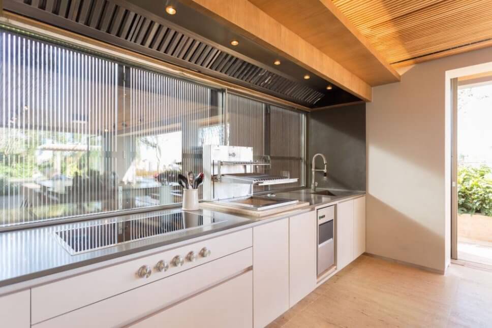 …eine kompakte, grifflose Kochzeile mit integrierter Grillstation bildet das Kopfende der Gartenküche…