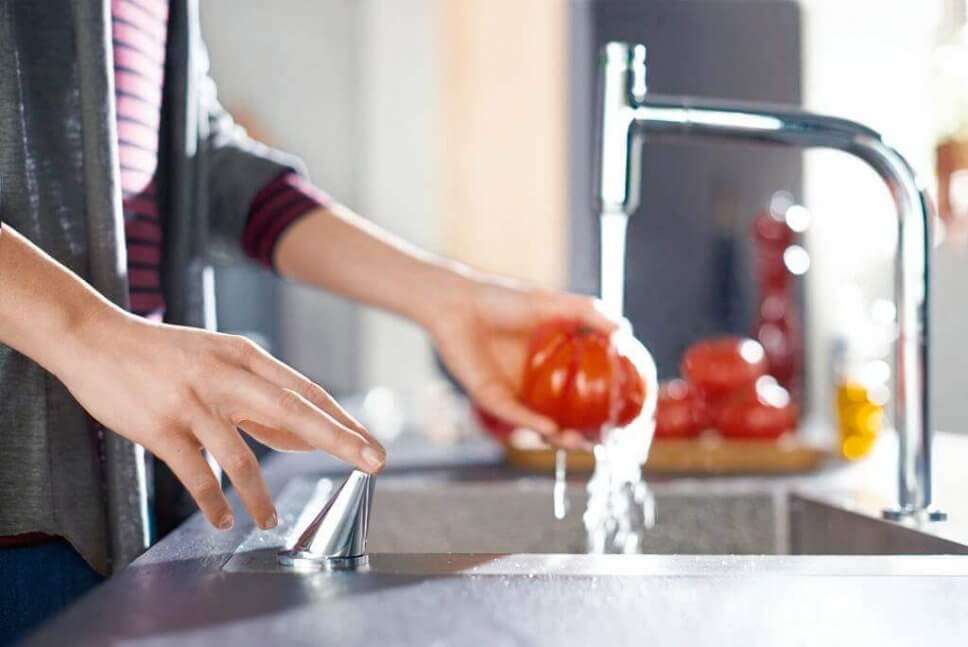 Spüle und Armatur bilden bei der KitchenSinkCombi von Hansgrohe eine Einheit und lassen sich so kinderleicht via Select-Knopf bedienen…
