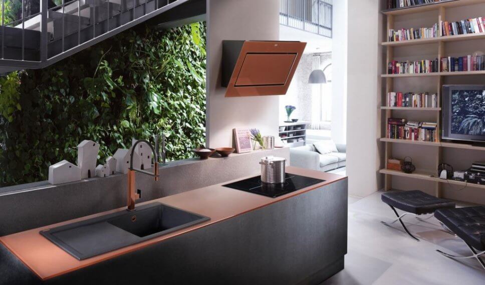 Franke setzt auf den Trendstoff Kupfer und stimmt den gesamten Arbeitsbereich optisch perfekt aufeinander ab: Abzugshaube und Armatur kontrastieren mit der onyxfarbenen Fragranit-Spüle