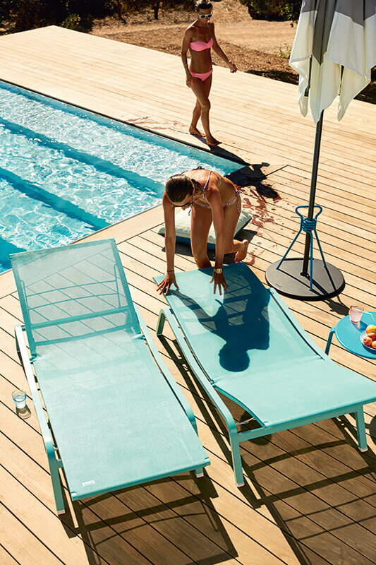…die Alize-Liegen laden zum Sonnenbad ein. Dank des Bezugs aus Outdoor-Gewebe und der verstellbaren Rückenlehne liegt es sich hier sehr bequem…