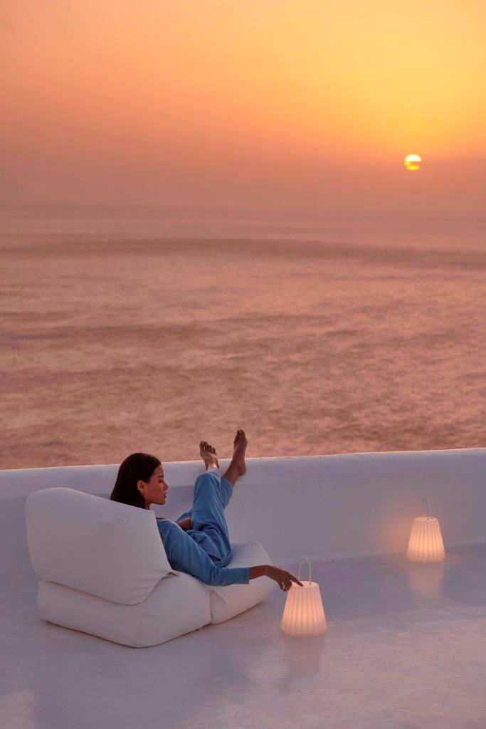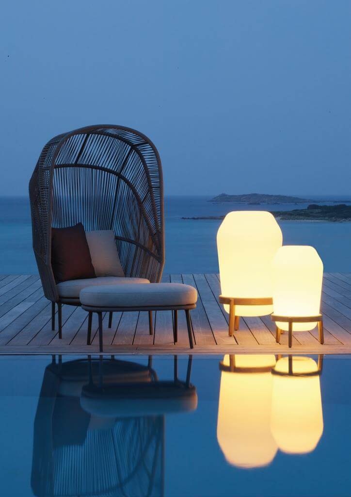 …in die perfekte Position lässt sich Grapy knautschen, das neue Outdoorpolster von Kensaku Oshiro. Die Plisy-Leuchten stammen vom Tochterbrand Diabla