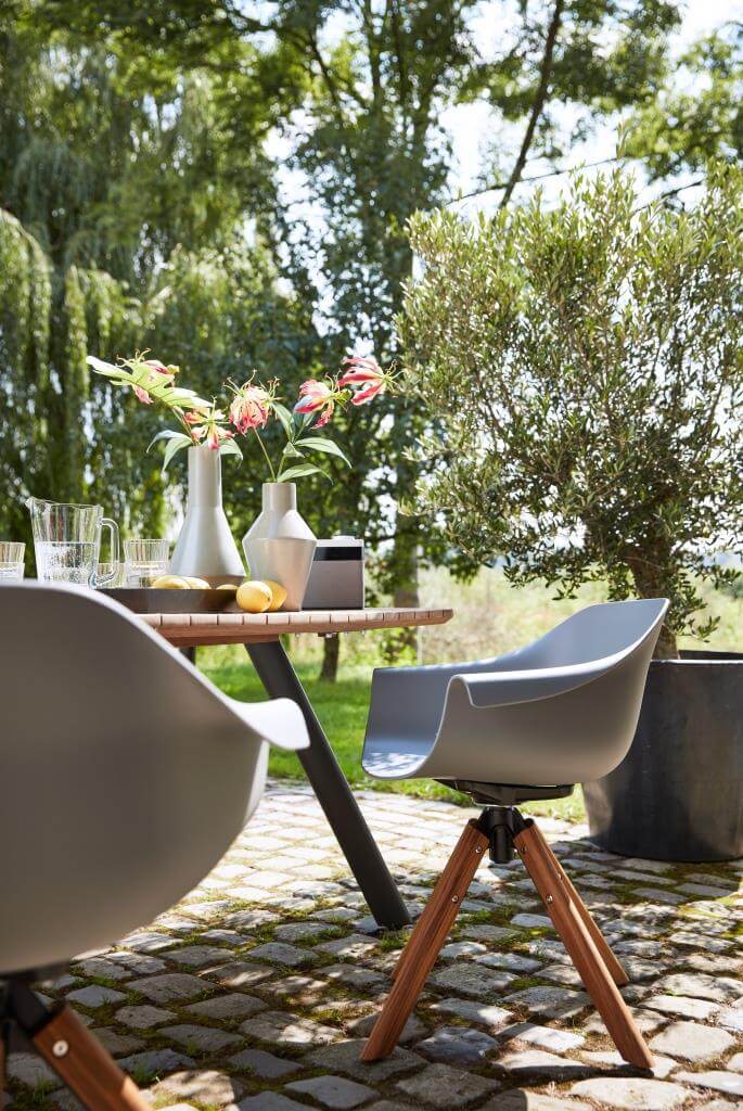 …draußen wie drinnen macht sich der neue X-Frame-Tisch des Dänen nützlich: Auf das markante Teakholz-Gestell legt er eine graue Glasplatte