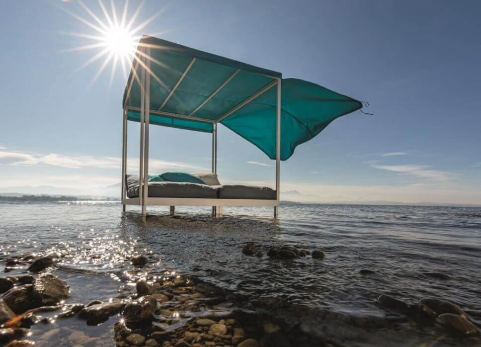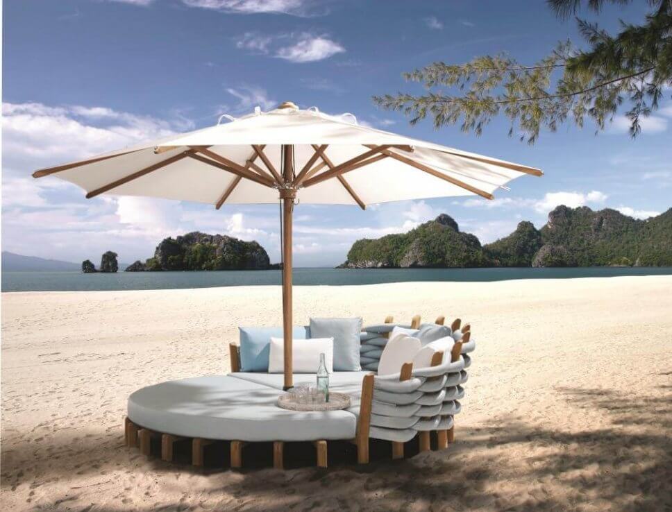 …ein opulentes Daybed entwirft Patricia Urquiola mit Trampoline. Optional: der schützende Baldachin