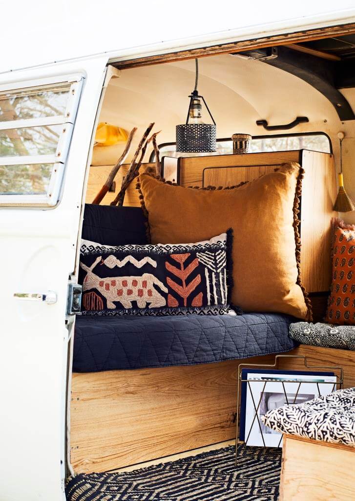 …wohnlich wird es im Bully mit kuscheligen Kissen, gleich ob hübsch bestickt oder mit Fransen verziert…