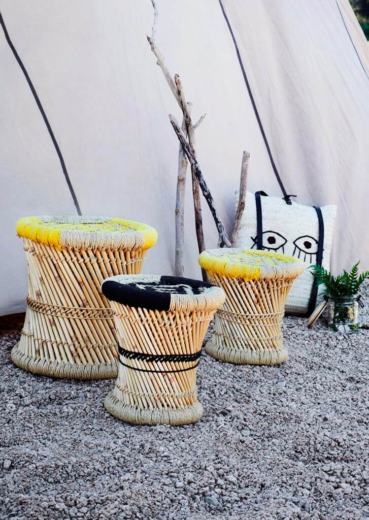 …die Bambushocker mit ihrem bunten Finish lassen sich unter den Arm nehmen und bieten Platz, wo immer welcher gebraucht wird…