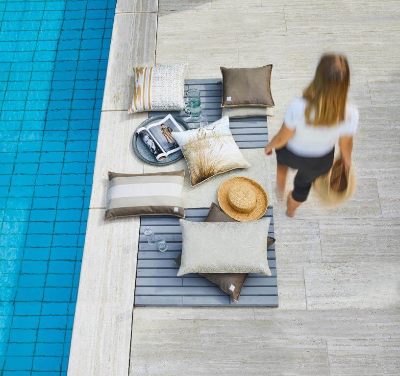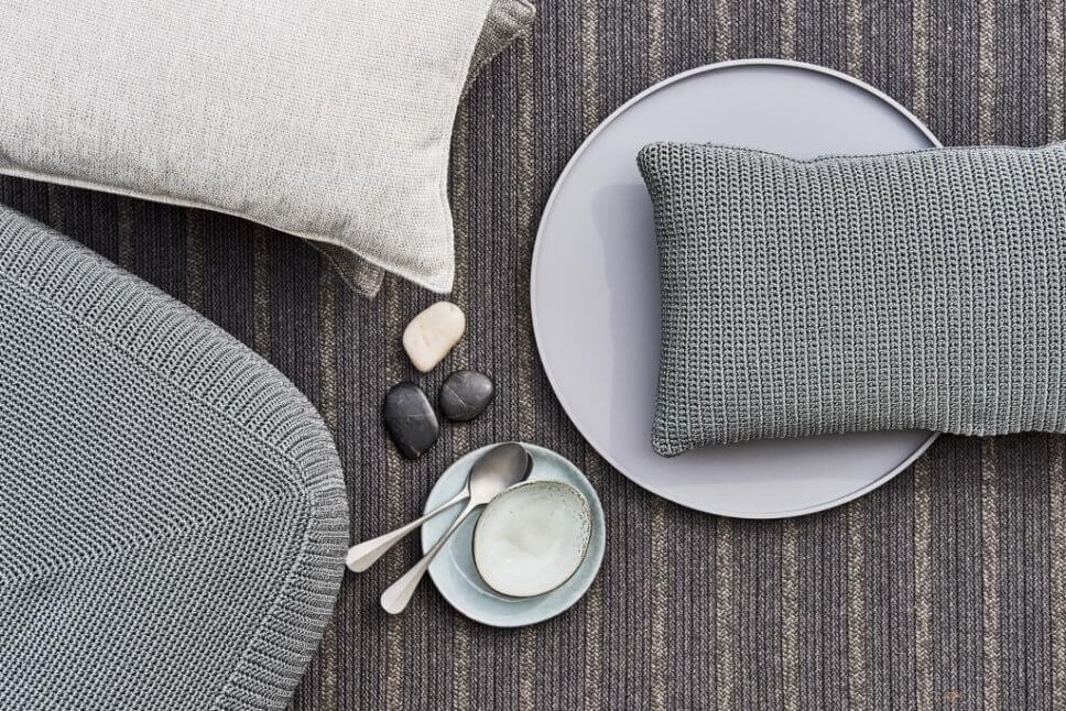 Dezente Dessins und zurückhaltende Farben bestimmen die textilen Accessoires von Outdoormöbler Cane-Line…