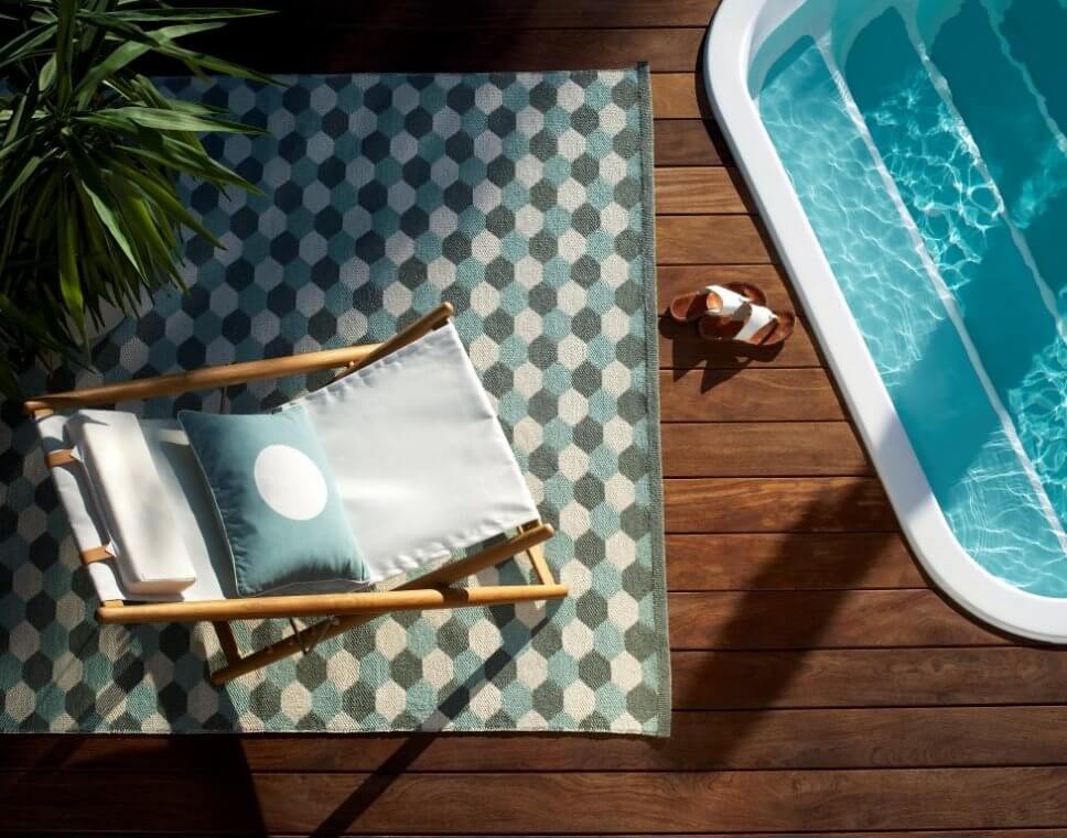 …die robuste Auslegware aus recyceltem Kunststoff wartet mit geometrischen Mustern auf