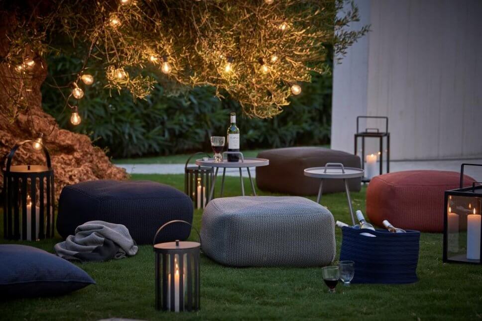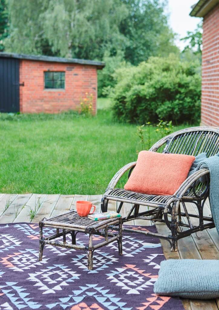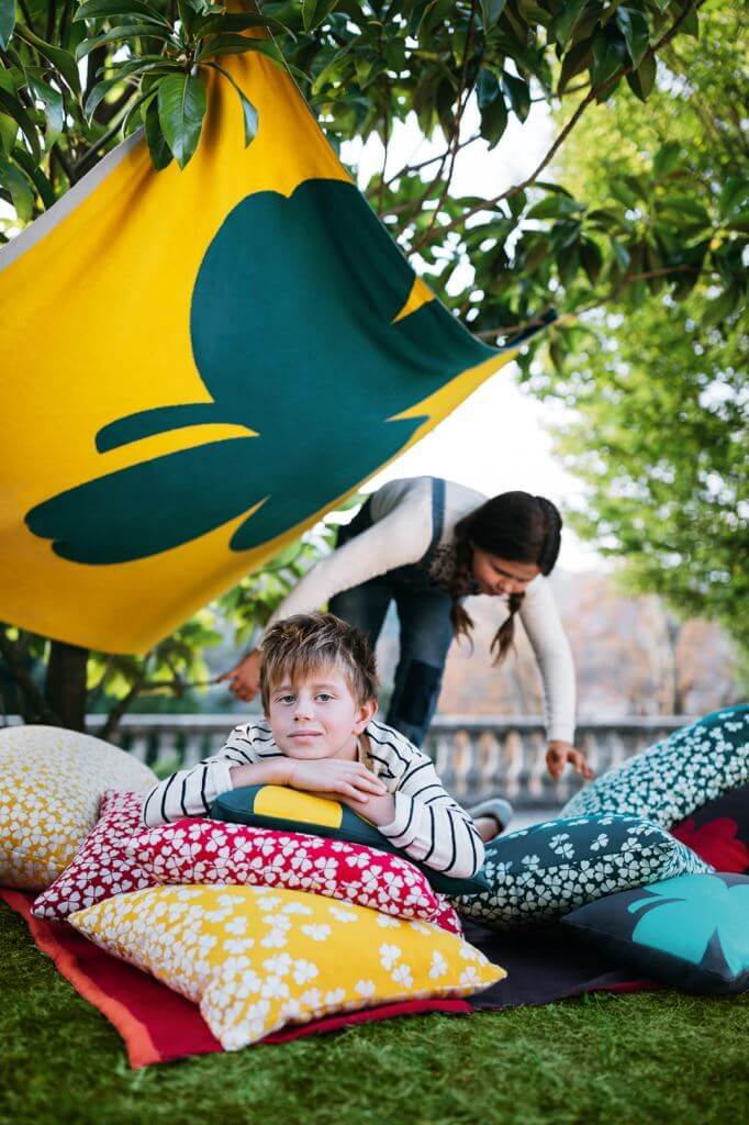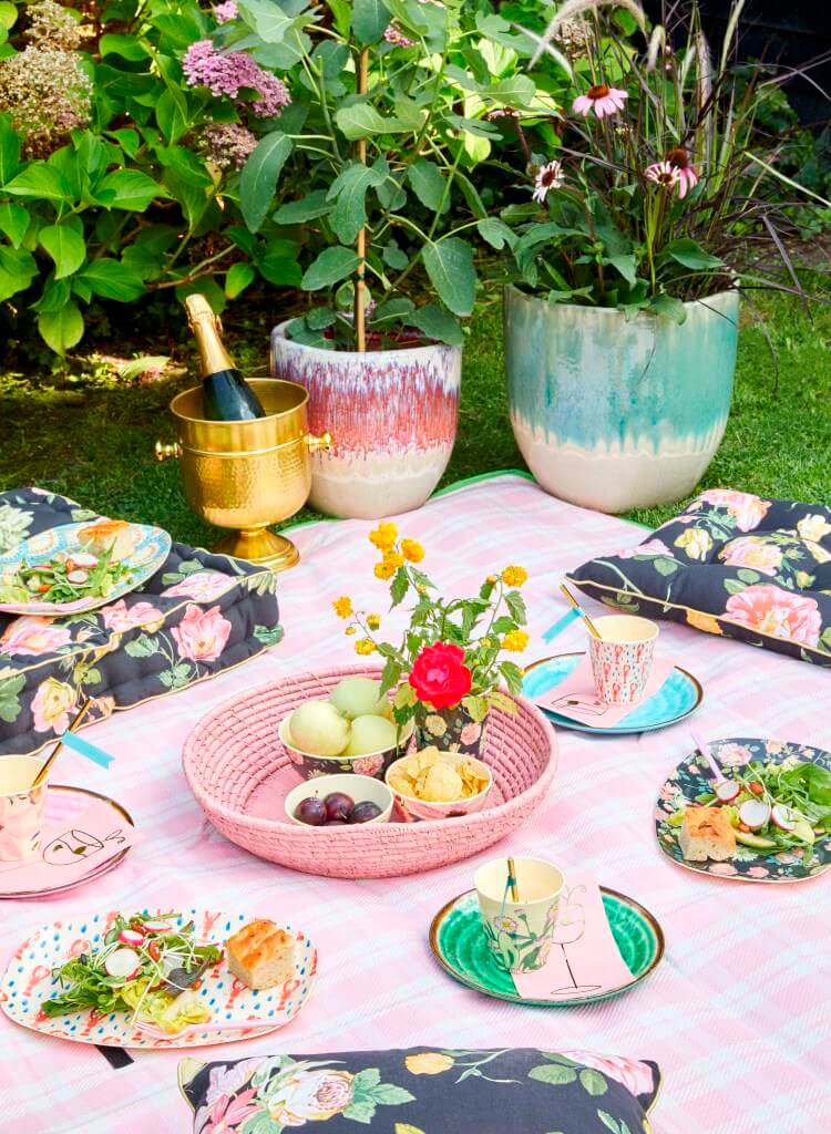 Zum Picknick in den Garten lädt Rice Denmark auf Karoplaid und mit blumigen Sitzkissen ein