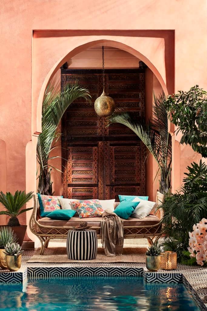 Einen Hauch Exotik bringt H&M Home mit opulenten Blumendessins und kräftigen Türkistönen auf die Terrasse