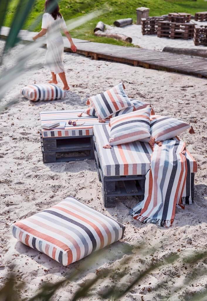 Mit fröhlichen Streifen bezieht Liv Interior strandtaugliche Polster, Decken und Kissen…