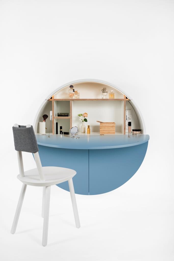 Minimalistisch in der Form, stark in der Funktion: Pill nennt Emko seinen runden Wandschrank, deren Tischplatte das Schatzkästchen schließt