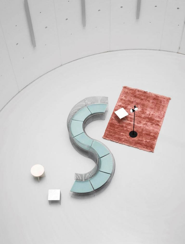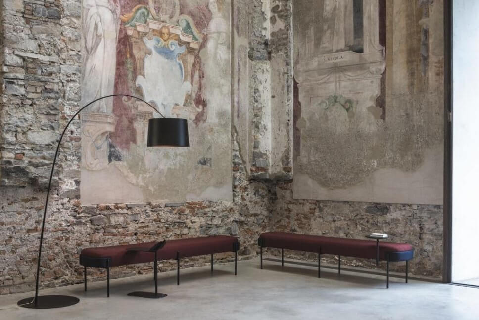 …die Kreativen von Granstudio kombinieren bei ihrem eleganten Bänkchen pulverbeschichteten Stahl mit ausgesuchten Stoffen…