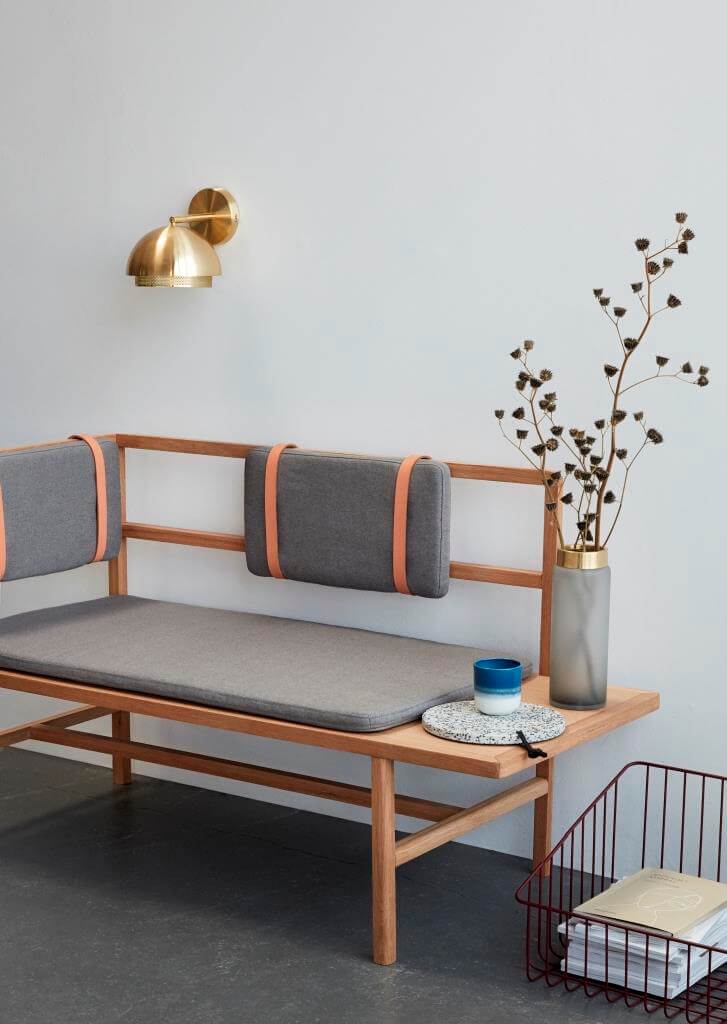 Hübsch Interior bringt eine kleine, feine Holzbank auf den Markt. Ganz charmant sind die mit Lederbändern fixierbaren Rückenpolster