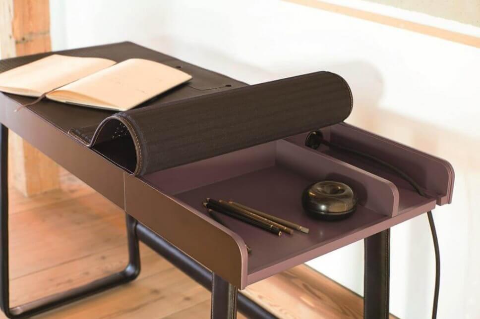 Mit einer Schreibfläche aus Leder und nützlichen Accessoires zum Einhängen stattet Alivar den Scribe aus der Feder von Giuseppe Bavuso aus